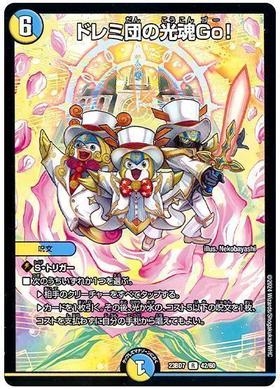・カードを1枚引く。その後、光または水のコスト5以下の呪文を1枚、コストを支払わずに自分の手札から唱えてもよい。