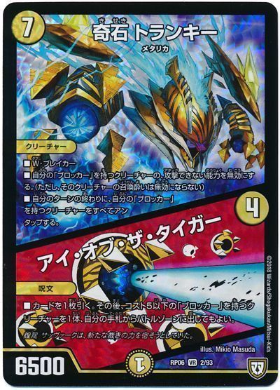 S・トリガーで相手ターンに《〜世紀末の善悪〜》を出す事ができる点は非常に優秀ですが、本デッキは序盤の手札リソースが割とカツカツで、《アイ・オブ・ザ・タイガー》のドローが助かっているのと、そちらと《龍素記号wDサイクルペディア》の相性の良さを優先して、サンプルリストには採用されていません。