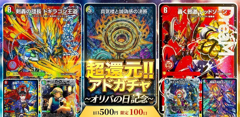 どういうことか?こちらのオリパは1口500円で、当たりには《剣轟の団長 ドギラゴン王道》、《轟く邪道 レッドゾーン》といった高額カードや500円以上の当たりカードが入っていることはもちろん。