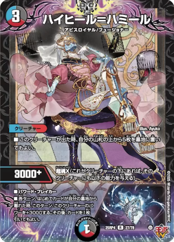 《 ハイヒール=ハミール 》を進化元にすることで突然5枚ブレイクを叩き込めるようになるのはもちろん、「どちらも3コストなので同時踏み倒しも容易」「自身の効果で山札から《 ハイヒール=ハミール 》が進化元にやってくることもある」などなど噛み合いは良好。