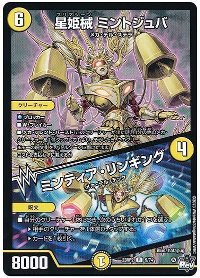 小型クリーチャーの枠を埋めるなら≪パトファール-P4≫に《星姫械 エルナドンナ》あたり、《俳句爵 Drache der’Bande》からの踏み倒し先としては《星姫械 ミントジュバ / ミンティア・リンギング》・《ゴルパガーニ-A7 / ダウンフォース・サーキュラー》辺りが選択肢ですかね。どうしても光単色で枠を喰ってしまうので、しっかり精査して投入すべきかも。