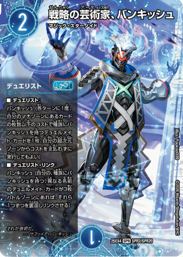 一方でワリを喰ったのが《戦略の芸術家、バンキッシュ》。能力自体は文句なく強力なのですが1人で超次元ゾーンを3枠要求するので、ホール呪文と喧嘩しちゃうんですよね……。ということでサンプルでは涙の不採用。強力には違いないので、ここは発売後に練り込んでいくことにいたしましょう。