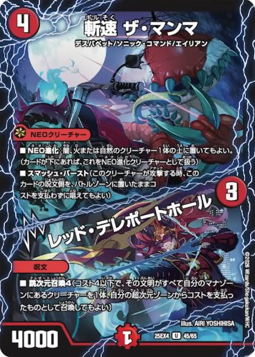 《光器ガガ・マドンナ》《セブ・マゴアクアン》の例に漏れず、《斬速 ザ・マンマ/レッド・テレポートホール》も非常に優秀。攻撃すれば侵略を重ねつつ、スマッシュ・バーストで横にも打点を用意できちゃう破格の仕様です。パンドラ・シフトしておいた《超次元の王家》なども出せてしまうのがニクイ。