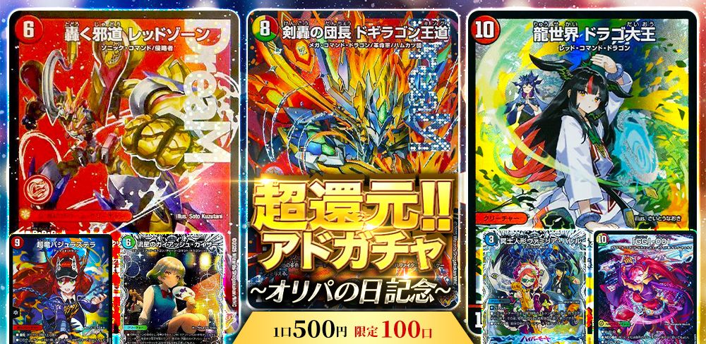 目玉には、シークレットの《剣轟の団長 ドギラゴン王道》や《轟く邪道 レッドゾーン》といった買取10万円越えの爆裂ドリーム大当たりもご用意しました…。