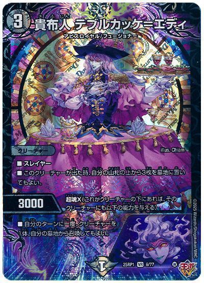 ■各ターンに1度、自分が呪文を唱えた時、跳次元召喚6してもよい。(コスト6以下で、その文明がすべて自分のマナゾーンにあるクリーチャーを1体、自分の超次元ゾーンからコストを支払ったものとして召喚してもよい)