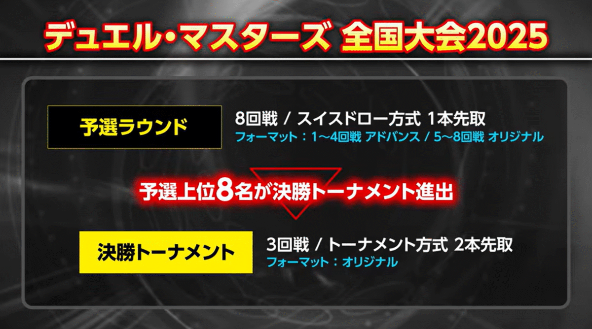 予選は「アドバンス4回+オリジナル4回」の計8試合を行い、上位8名のプレイヤーが本戦に上がります。その後オリジナル3戦で本戦を行い、強豪との11試合を制したプレイヤーが2025年の日本一として決定します!