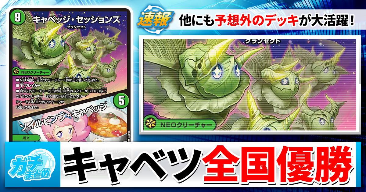 小型のメタクリーチャーを押し付けあうゲームが多いオリジナルでは、《飛翔龍 5000VT》を強く使う【青黒コンプレックス】と大量のリソースで押しつぶす【自然単キャベツ】がメタをかいくぐって上がってきたようです。