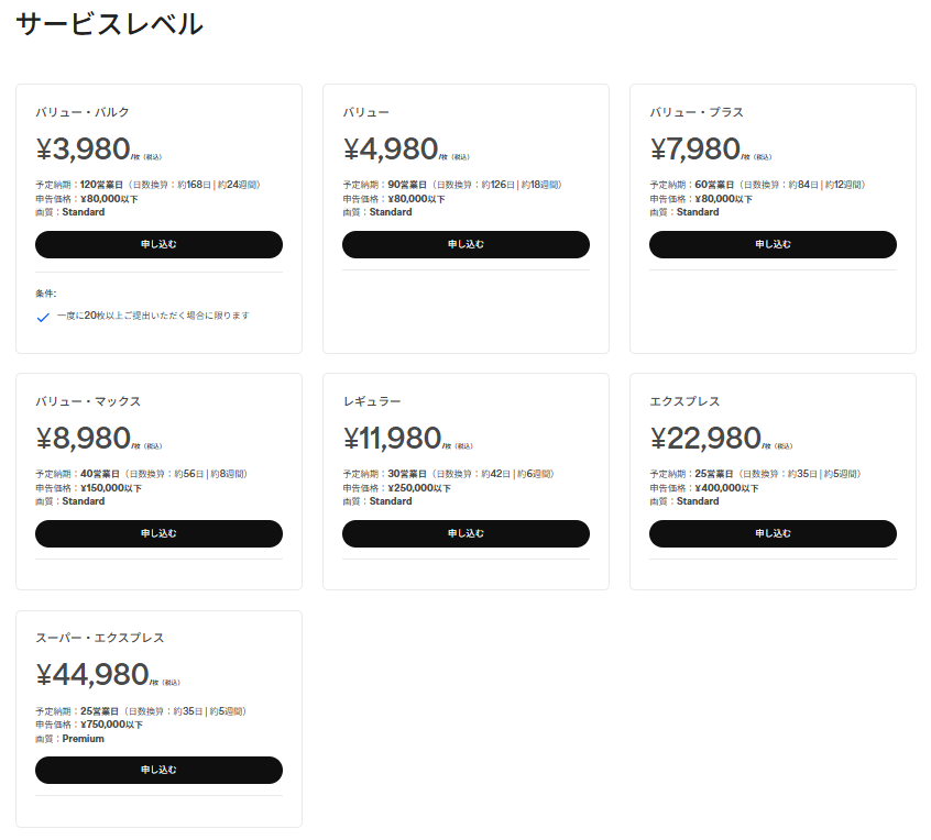 PSA日本支社を通じて申し込む場合でも、アメリカの本社へ直接申し込む場合でも、1枚あたりの鑑定料はカードの申告価格(そのカードの現在の価値)によって変動します。最も安い「バリュープラン」でも1枚あたり4000円の費用がかかりますし、数十万円、数百万円の高額カードになればなるほど、プレミアムプランが適用され鑑定料も数万円〜十数万円と跳ね上がります。