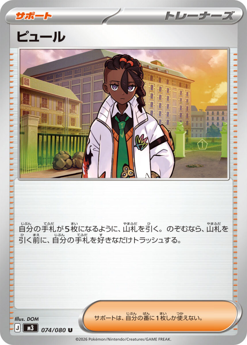 中終盤で手札に溜まった不要札(なかよしポフィンやポケモン)を捨てて山札を強くする目的で採用。あまり山札が引けるわけではないので1枚としています。