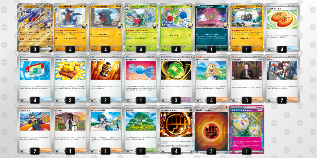 このデッキには特殊エネルギーの《ロック闘エネルギー》と《ネオアッパーエネルギー》が採用されているため確定でサーチする動きや《シロナのガバイト》+エネルギーで持って来る動きがデッキを安定させて強力なため採用しています。