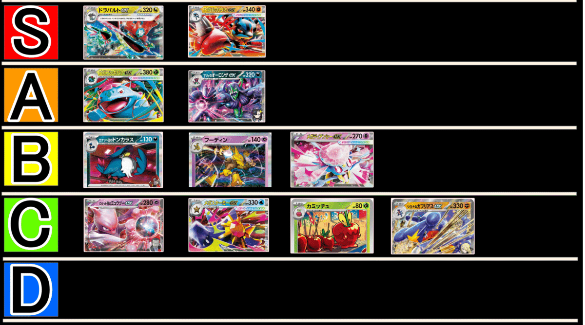事前メタゲーム予想で母数が多いとされる《ドラパルトex》と《メガルカリオex》に対して、このデッキは《シロナのパワーウェイト》による高耐久や、「グローリーエール」込みの「リューノバスター」でワンパンを狙う事もできるため、大きく不利を取らずに戦う事が出来ていると考えていました。