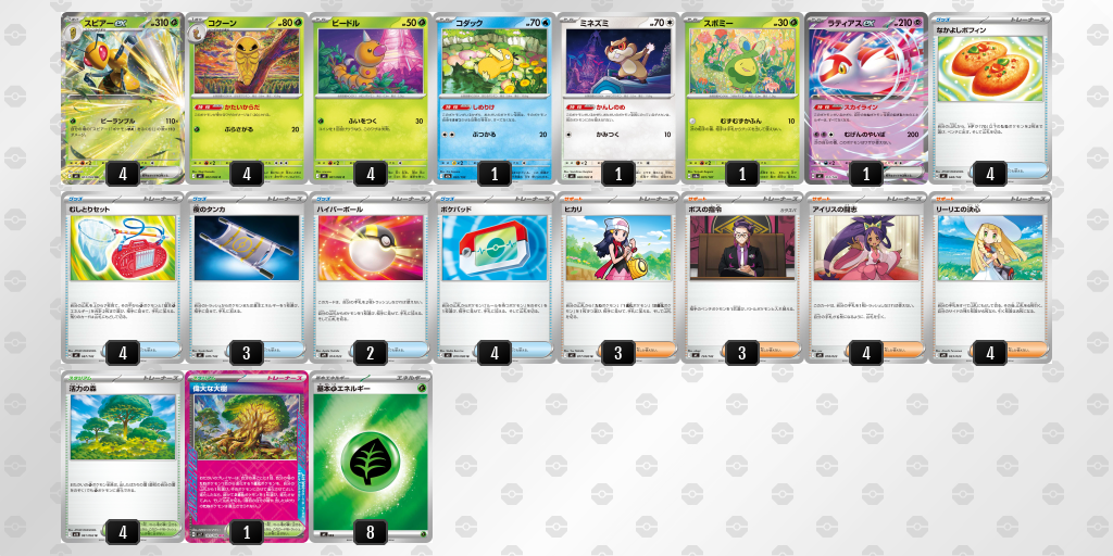 今回は安定して《スピアーex》を揃えるために《偉大な大樹》を採用していますが、《活力の森》で即時立て直しができるので《ポケモン回収サイクロン》もおススメです!