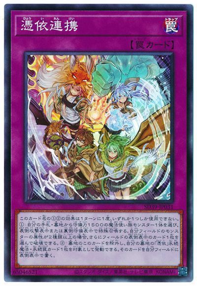 このカード名の③の効果は1ターンに1度しか使用できない。①:自分フィールドのモンスターの攻撃力は、自分フィールドのモンスターの属性の種類×300アップする。②:自分フィールドの「霊使い」モンスター及び「憑依装着」モンスターは効果では破壊されない。③:自分フィールドに攻撃力1850の魔法使い族モンスターが召喚・特殊召喚された場合に発動する。自分はデッキから1枚ドローする。
