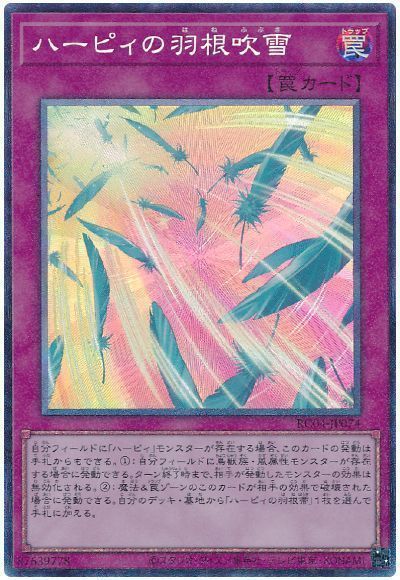 本来【ハーピィ】デッキの切り札ですが、【ふわんだりぃず】をはじめ鳥獣族系のテーマで先攻札として使われ続け、現在も【絢嵐】などの一部のデッキで使われています。リンクの汎用鳥獣族のおかげで場に鳥獣族がいるという条件がめちゃめちゃ満たしやすいというのもあり、強力な先行罠でしたがこちらもアクセスが難しくなりました。