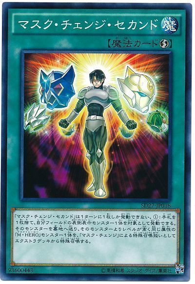 ①:手札を1枚捨て、自分フィールドの表側表示モンスター1体を対象として発動できる。そのモンスターを墓地へ送り、そのモンスターよりレベルが高く同じ属性の「M・HERO」モンスター1体を、「マスク・チェンジ」による特殊召喚扱いとしてエクストラデッキから特殊召喚する。