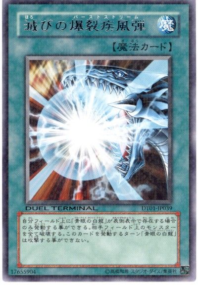 「青眼の白龍」が自分フィールド上に表側表示で存在している時のみ発動する事ができる。相手フィールド上のモンスター全てを破壊する。このカードを発動したターン「青眼の白龍」は攻撃できない。