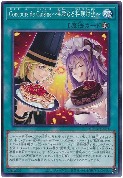 1. 手札から《Concours de Cuisine~菓冷なる料理対決~》を発動、デッキ・EXデッキから自分フィールドに《ポワソニエル・ド・ヌーベルズ》、相手フィールドに《聖菓使クーベル》を特殊召喚する