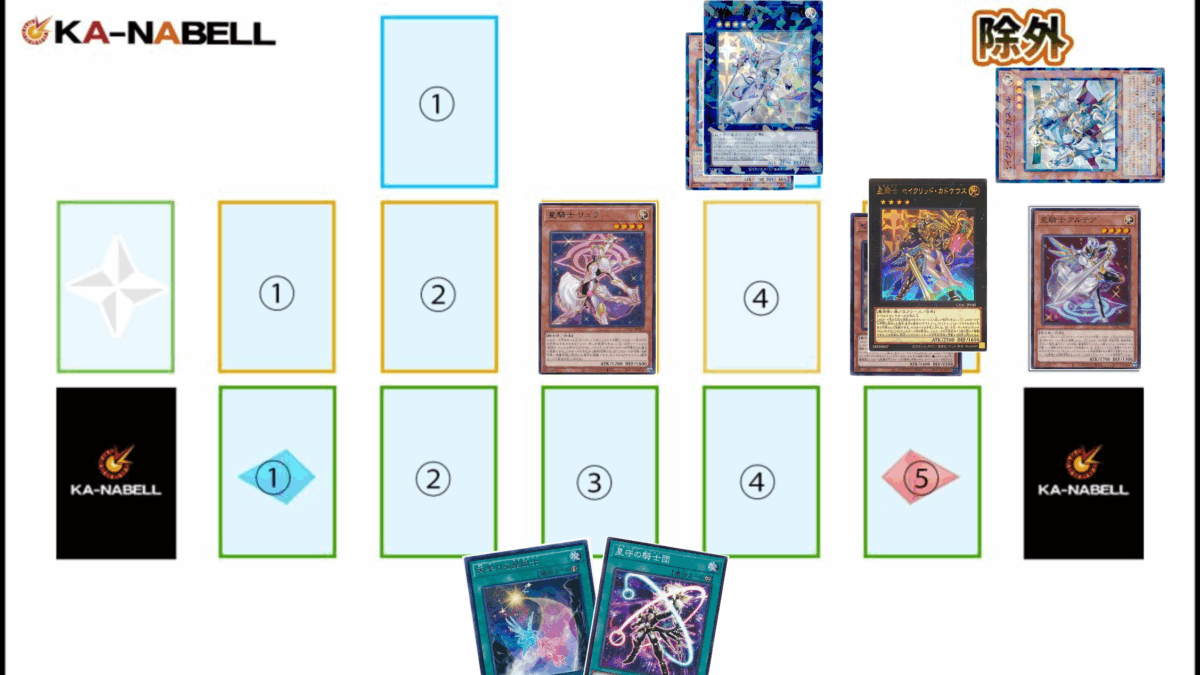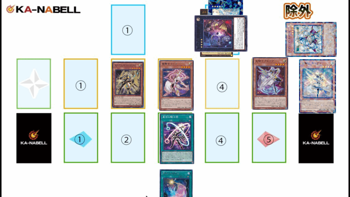 4.《セイクリッド・カストル》《星騎士キュグニ》を素材に《星騎士セイクリッド・デルタテロス》をエクシーズ召喚。②を発動し、デッキから《星騎士アルテア》をサーチし、召喚。
