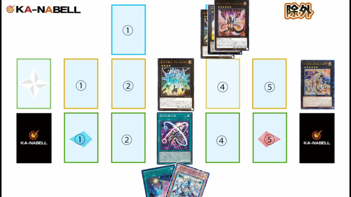 《星守の騎士プトレマイオス》のターンスキップを目指す際は最終的に5素材の《セイクリッド・カドケウス》を着地させ、《セイクリッド・トレミスM7》を重ねて《星守の騎士団》の②で《星守の騎士プトレマイオス》を特殊召喚して7素材にするのがポイントになります。