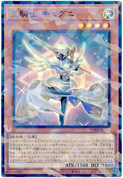 《セイクリッド・カストル》(デッキから特殊召喚)→《星騎士キュグニ》(モンスターサーチ)→《セイクリッド・カドケウス》(魔法サーチ)→エクシーズしたこのカードで更に展開を伸ばすのが基本のムーヴとなります。