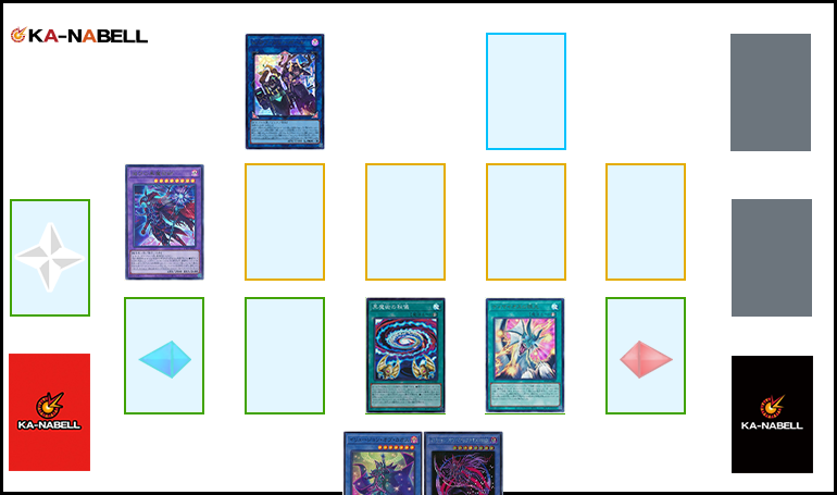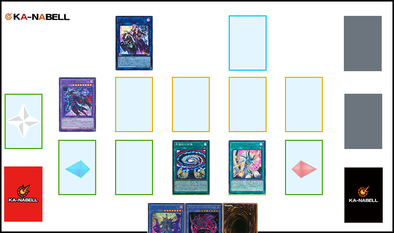 - 6.《マジシャンズ・ソウルズ》《マジシャンズ・ロッド》を素材に《瘴煙の死霊術師》をL召喚。《瘴煙の死霊術師》の効果を発動し墓地の《魔術師の弟子-ブラック・マジシャン・ガール》を回収。