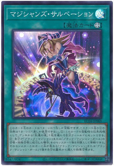 ①:1ターンに1度、魔法・罠・モンスターの効果が発動した時、自分フィールドの、「ブラック・マジシャン」または「ブラック・マジシャン・ガール」1体をリリースして発動できる。リリースしたモンスターとはカード名が異なる「ブラック・マジシャン」または「ブラック・マジシャン・ガール」1体を、自分の手札・墓地から選んで特殊召喚し、その発動した効果を無効にする。②:魔法&罠ゾーンの表側表示のこのカードが墓地へ送られた場合に発動できる。フィールドのカード1枚を選んで破壊する。