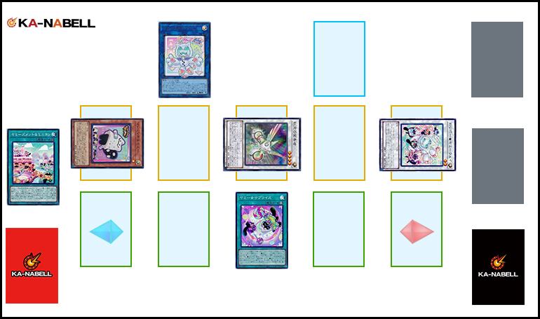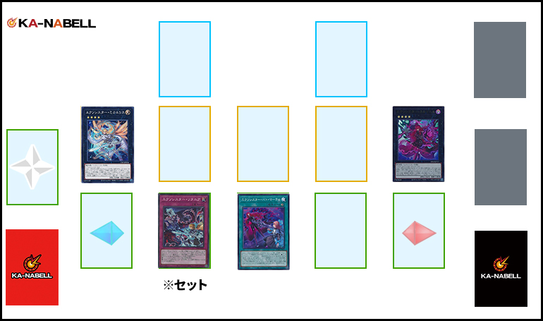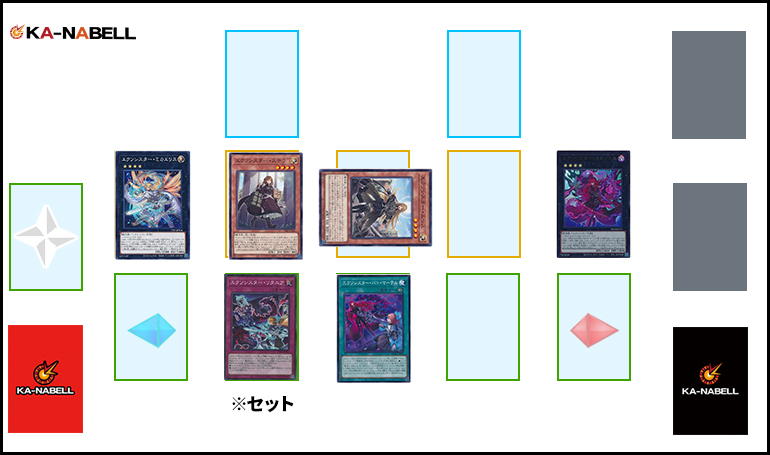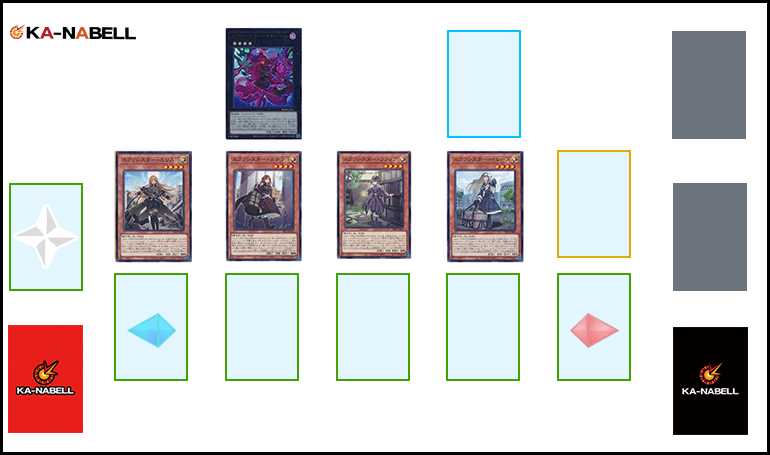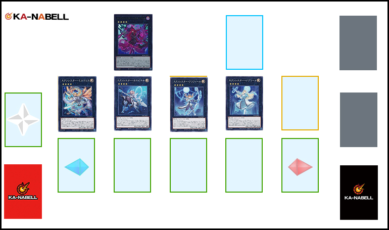 先程行った展開に追加して、《エクソシスター・エリス》及び《エクソシスター・ステラ》が場に形成されています。これによって、《エクソシスター・カルマエル》の効果等を起点に墓地のカードが離れた場合、追加して2体の【エクソシスター】エクシーズモンスターを特殊召喚する事が出来ます。