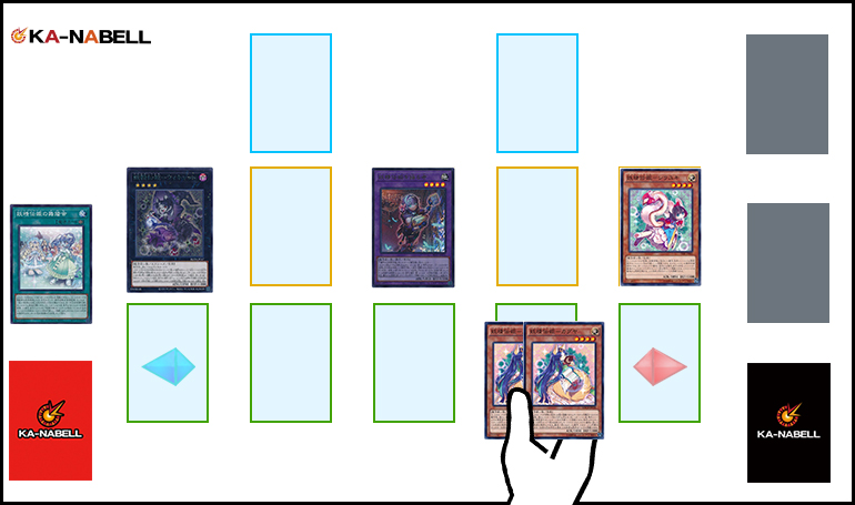 そのまま《妖精伝姫のはじまりはじまり》で手札・墓地・除外から、妨害効果を持った【妖精伝姫】モンスターを呼び出していきます。
