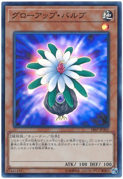 自分のデッキの一番上のカードを墓地へ送り、墓地に存在するこのカードを自分フィールド上に特殊召喚する事ができる。「グローアップ・バルブ」の効果はデュエル中に1度しか使用できない。