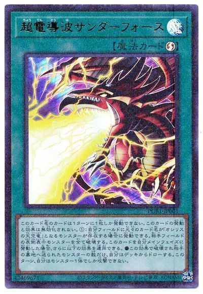 《超電導波サンダーフォース》はオシリスの攻撃名が元ネタとなるカードで、《オシリスの天空竜》が存在していれば相手の表側モンスターを全て破壊し、自分のメインフェイズにこのカードを発動していた場合は追加で破壊したモンスターの数だけドローできる効果となっています。
