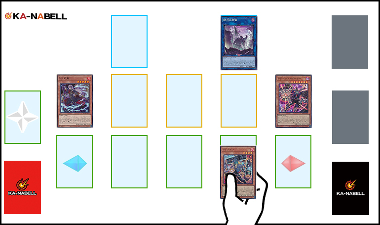 4. 《VS ラゼン》の効果を手札の炎・闇属性モンスターを見せて発動、自身と同じ列のモンスターをすべて破壊する