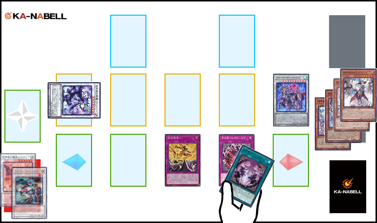 - 《白き森のアステーリャ》を召喚し①を発動、「コスト用魔法・罠カード」(2枚目)またはセットされた《白き森にはいるべからず》《罪宝の囁き》を墓地に送り《白き森のシルヴィ》をデッキから特殊召喚