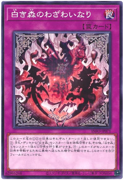 「白き森」モンスターの効果コストを1枚で2回まかなってくれる共通効果の②による再セットが優秀で、このデッキでは上記2枚に比べると優先度の下がる《白き森にはいるべからず》《罪宝の囁き》であっても共通効果を目的に採用しています。