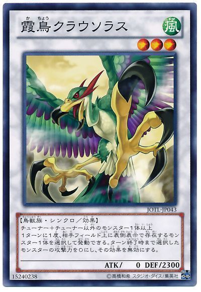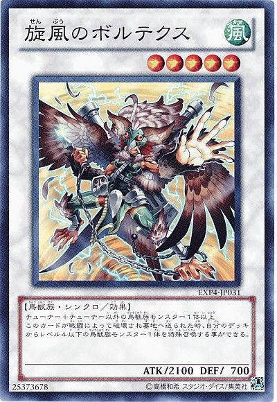 シンクロギミックを採用できるデッキであれば、レベル3では《霞鳥クラウソラス》、レベル5では《旋風のボルテクス》、レベル8では《ハーピィ・レディ・SC》が存在する為、これらのモンスターをシンクロ召喚する事でも、《ハーピィの羽根吹雪》の運用を行う事が可能です。※《旋風のボルテクス》のみ素材指定があります。