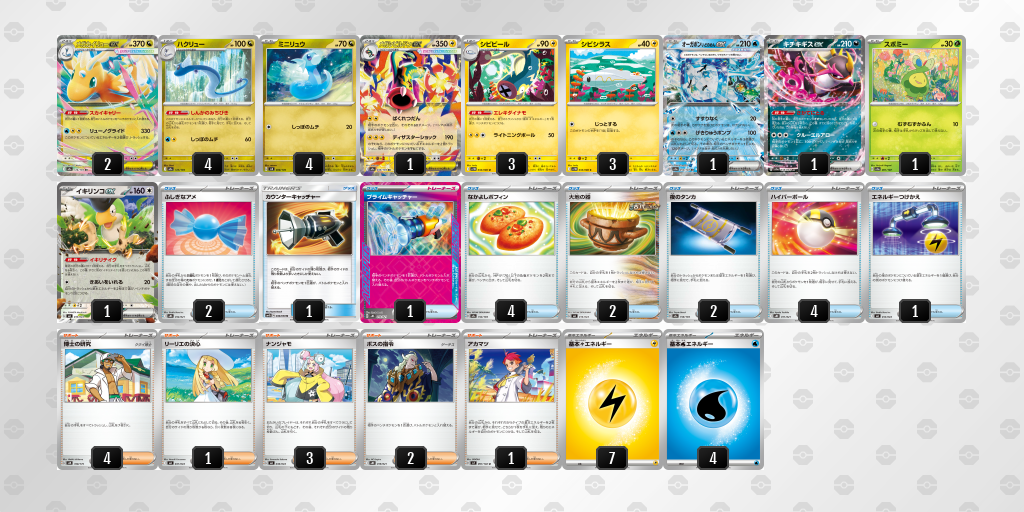 それを《シビビール》の「特性:エレキダイナモ」で保管し、毎ターン《メガカイリューex》で戦う構築になっています。
