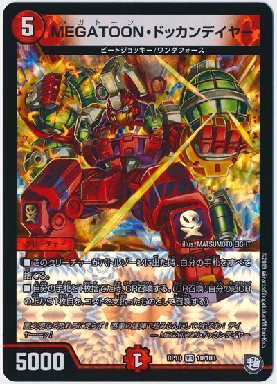 オリジナルでは追加の展開手段を持たないために返されることも多い《月下卍壊 ガ・リュミーズ 卍》+《凶鬼卍号 メラヴォルガル》でのフィニッシュも、《MEGATOON・ドッカンデイヤー》という最強の「二の矢」によって抜群の強度に仕上がっています。