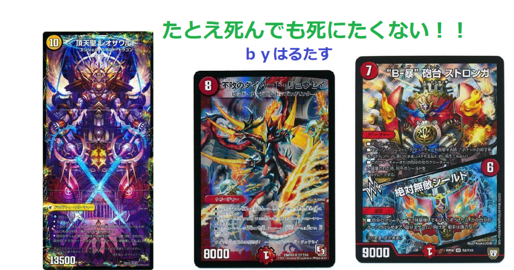 今回は趣向を変えて勝つために負けない方法をいろいろ考えてみましたが、やっぱり盤面ロックしたり、レジェンドドギラゴンで殴ったりする方が手間を考えると強そうですよね。それでも友人やフリーマッチとかでドヤ顔かませるくらいのコンボにはなっていると思うので一風変わったもの好きな方はつかってみてはどうでしょうか。それでは今回もここまでありがとうございました。